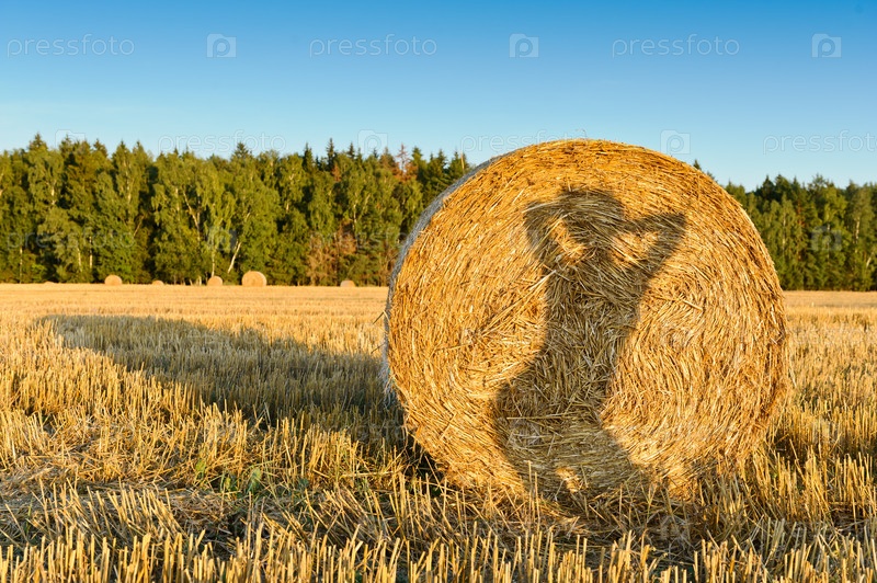 Женский силуэт на стоге сена в поле