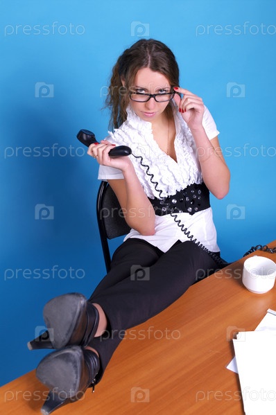 Деловая девушка говорит по телефону, положив ноги на стол