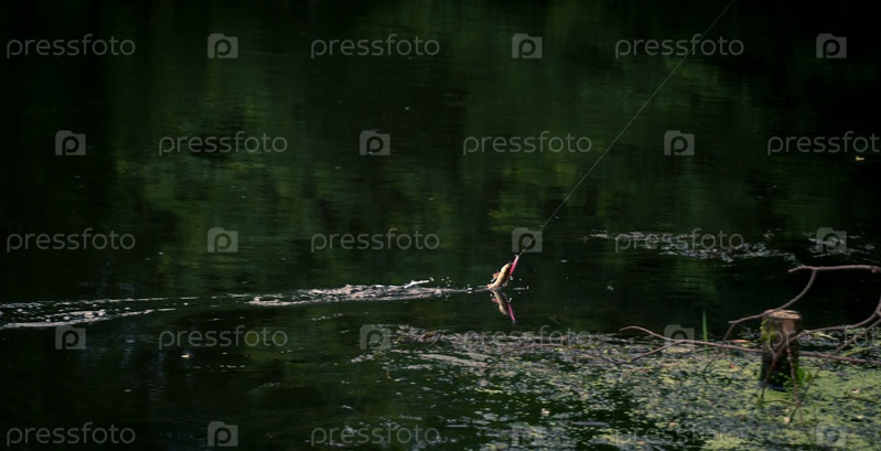 Поплавок на леске в лесном озере
