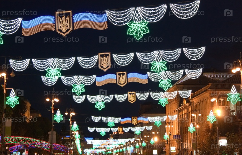 Неоновые украшения на Крещатике в ночном Киеве, Украина