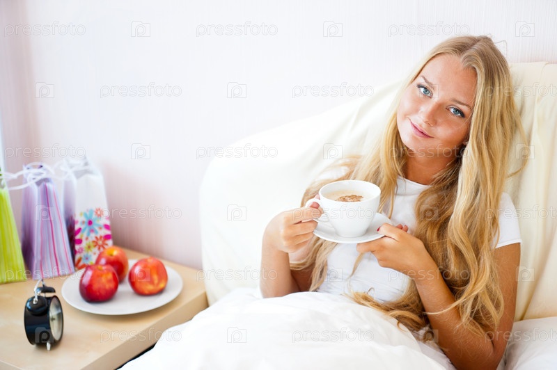 Портрет красивой девушки, которая пьет кофе в кровати