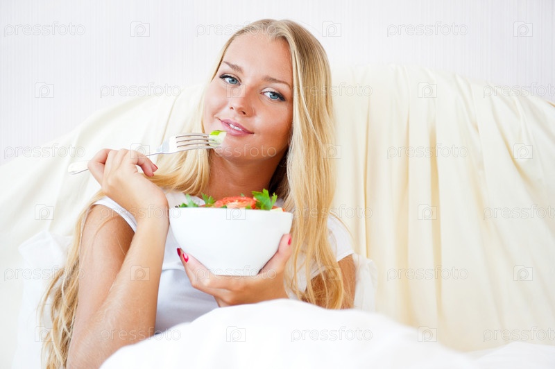 Портрет красивой девушки, которая завтракает в кровати