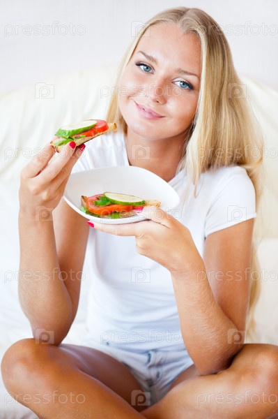 Портрет красивой девушки, которая ест бутерброды в кровати