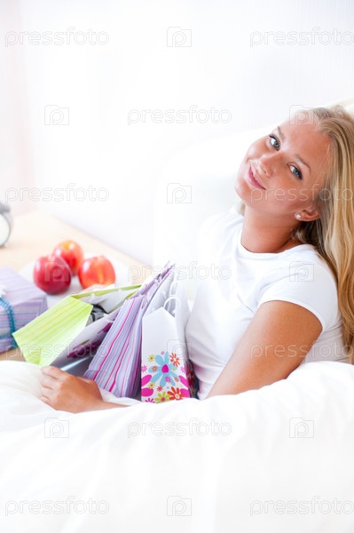 Красивая девушка с подарочными пакетами в спальне