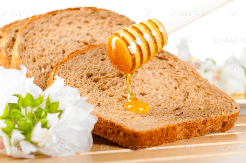 Мед, стекающий с ложки на хлеб