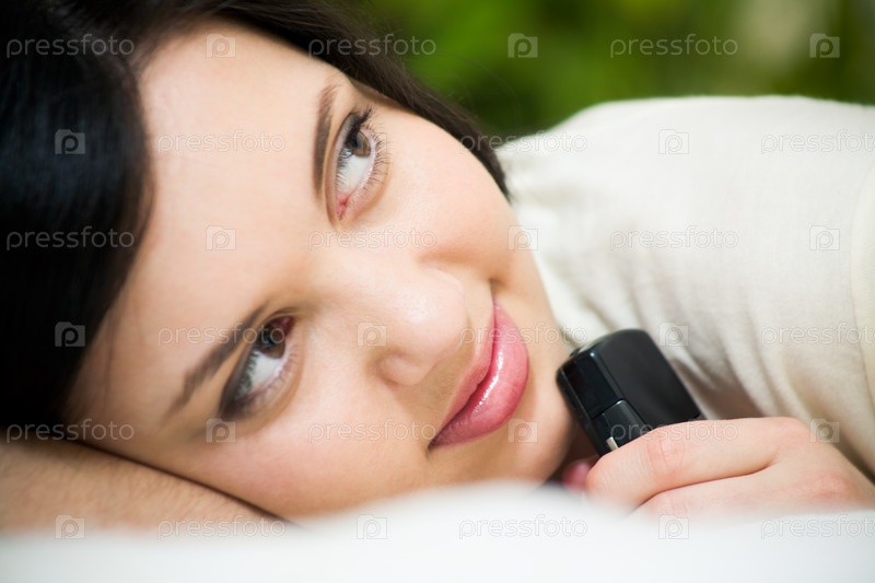 Лицо очаровательной девушки, держащей телефон за подбородок и смотрящей в сторону