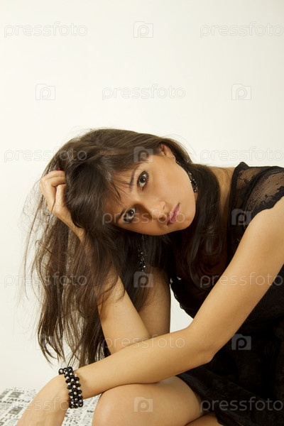 Молодая привлекательная женщина сидит, запустив руку в волосы, на белом фоне