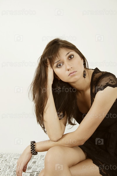 Молодая привлекательная женщина сидит, запустив руку в волосы, на белом фоне