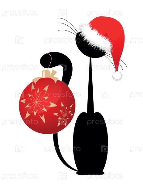 Черный рождественский котенок с большим красным шар