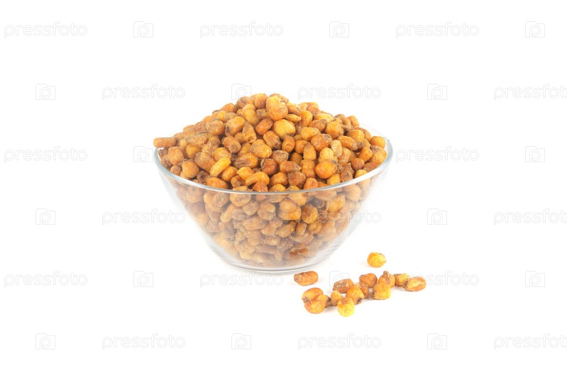Стеклянная прозрачная пиала с жареной кукурузой, на белом фоне