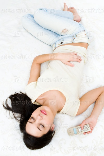 Вид на спокойную девушку, лежащую в удобной кровати и кивающую головой