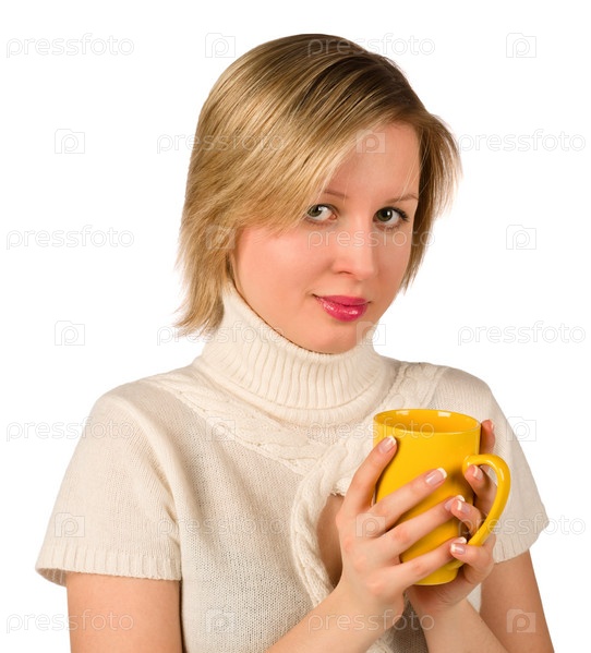 Красивая молодая девушка с желтой кружкой на белом фоне