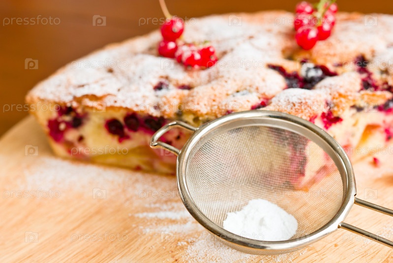 Сито для сахарной пудрой и пирог на деревянном столе