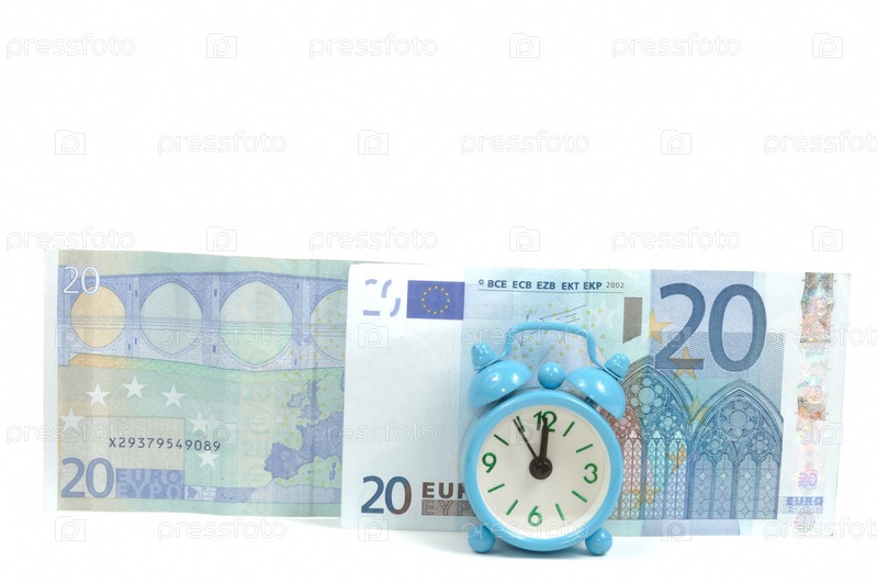 Будильник и пачка евро на белом фоне