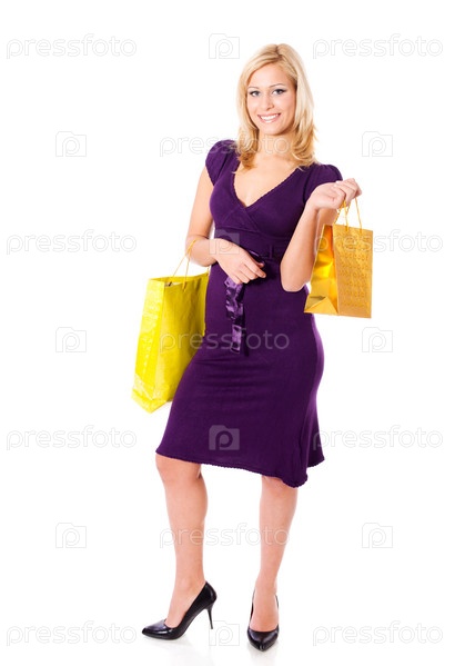 Портрет молодой девушки с пакетами в руках на белом фоне