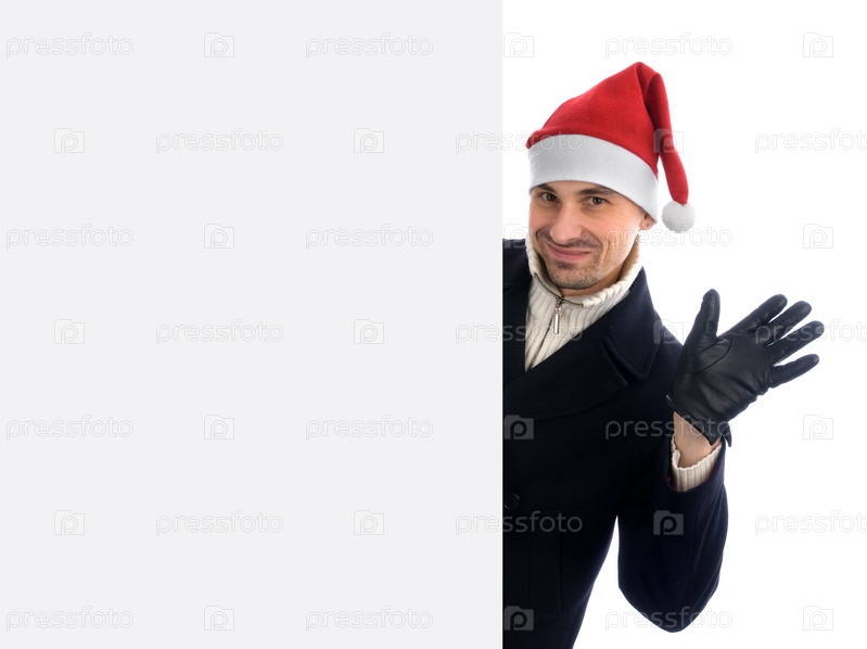 Счастливый мужчина в рождественской шляпе стоит рядом с белой пустой карточкой