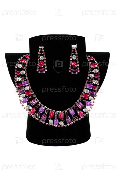 Этнические ожерелье с подвесками и серьги на черной подставке на белом фоне