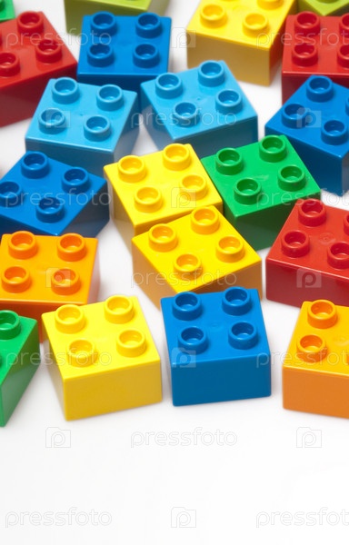 Разноцветные детали конструктора лежат на белом фоне