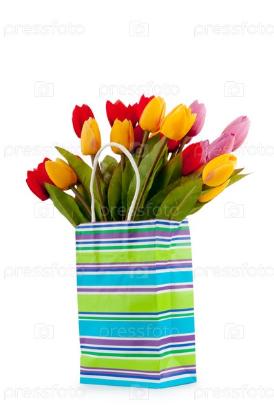 Тюльпаны в бумажном пакете, изолированные на белом фоне