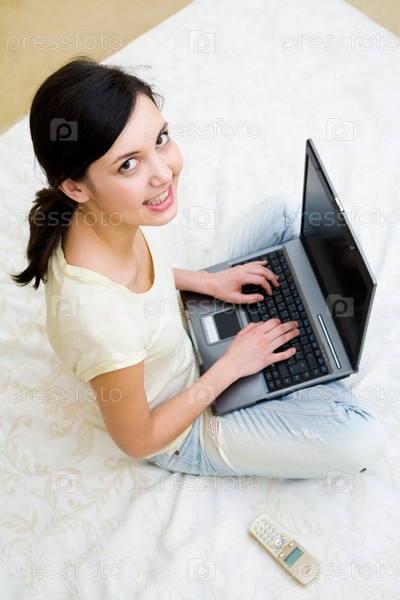 Вид сверху умного подростка, нажимающего кнопки ноутбука и смотрящего в камеру