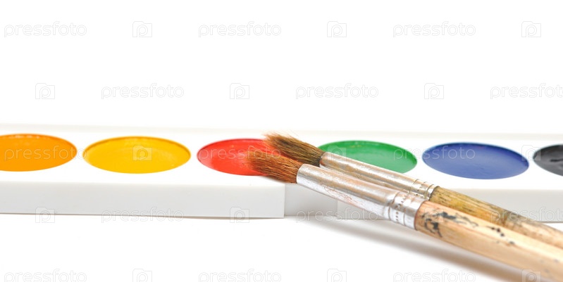 Акварельные краски и кисти на белом фоне