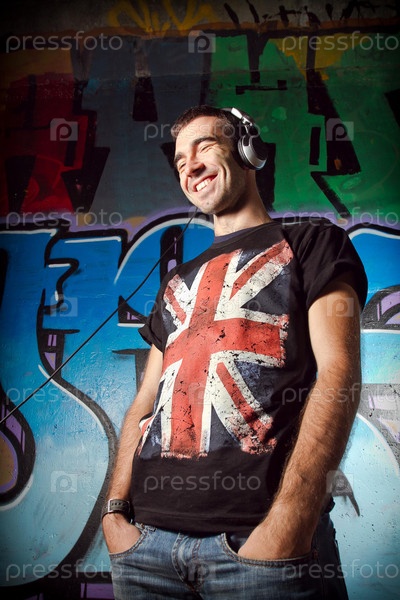 Довольный мужчина в наушниках на фоне стены с граффити
