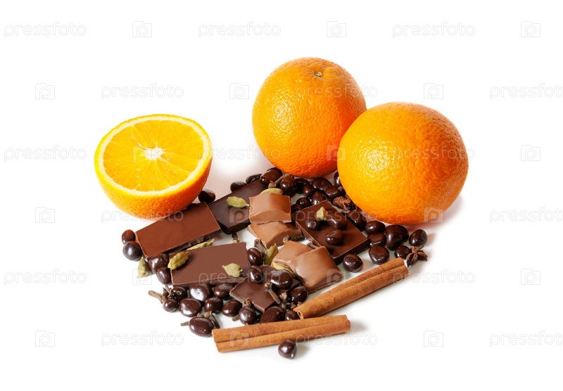 Шоколад, апельсин, специи, изолированные на белом