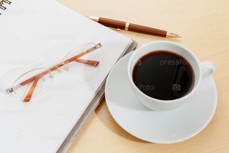 Ноутбук, чашка кофе, ручка и очки