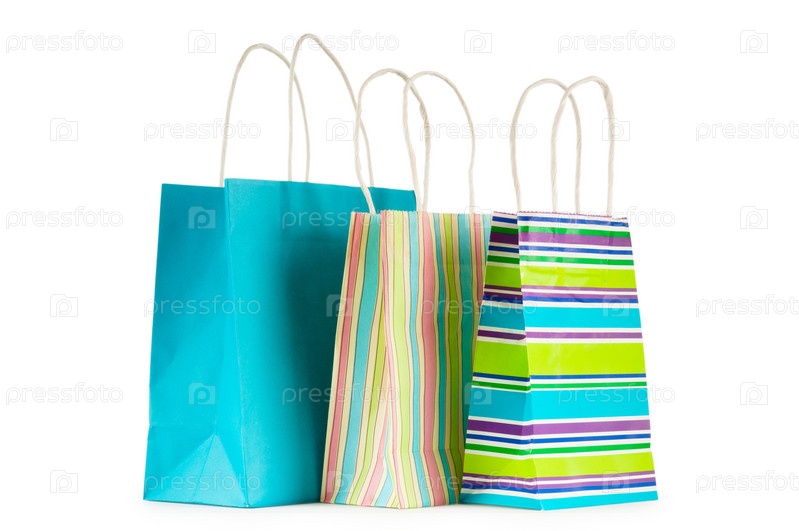 Три разноцветных пакета, изолированные на белом фоне