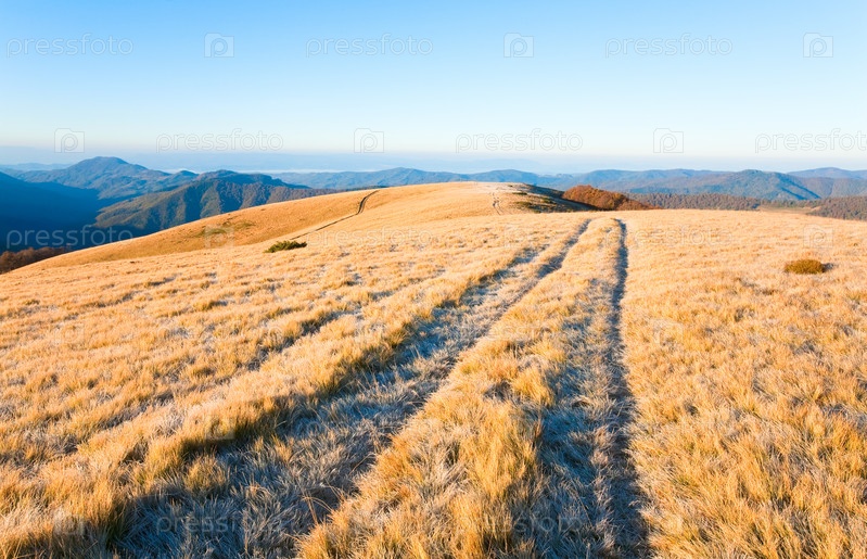 Утренний осенний пейзаж с проселочной дорогой. Карпаты, Украина