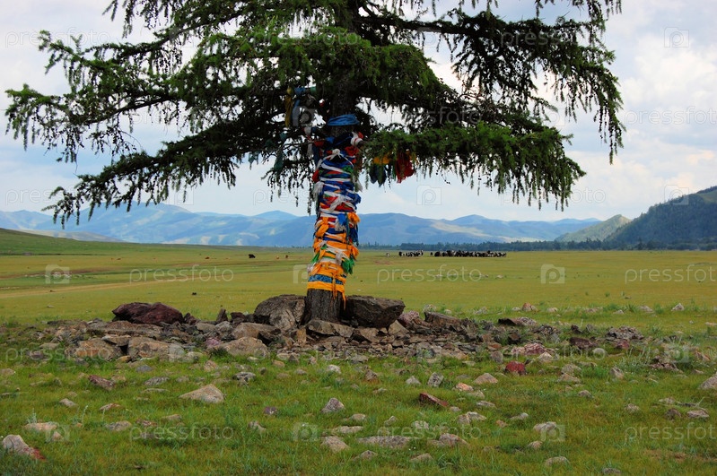 Тибетские буддийские молитвенные флаги вокруг дерева