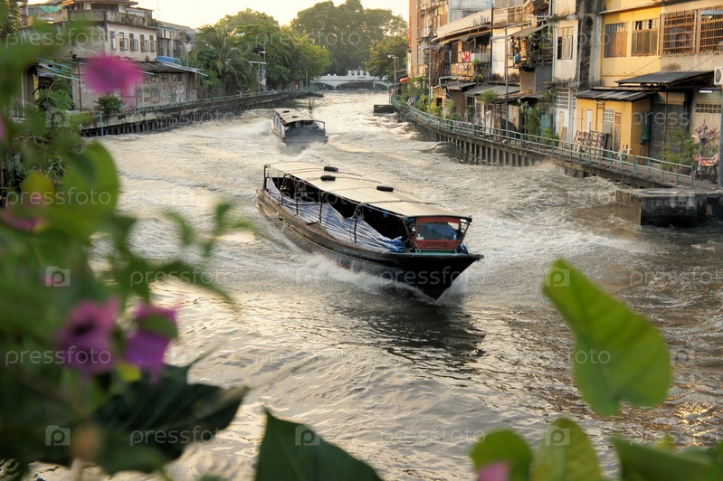 Лодка плывет по каналу Сан-Саеп в Бангкоке, Таиланд