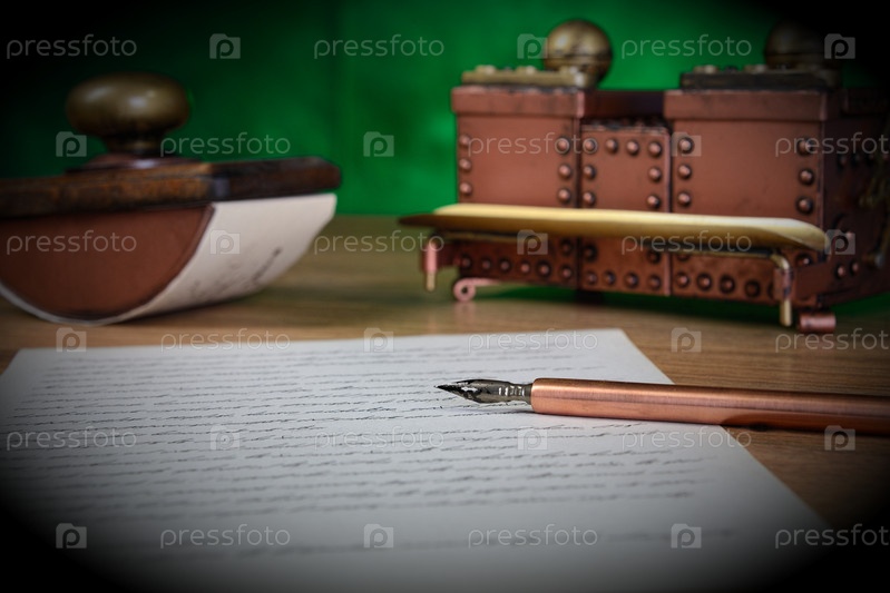 Бумага, чернильница и пресс-папье на столе. Низкая глубина резкости