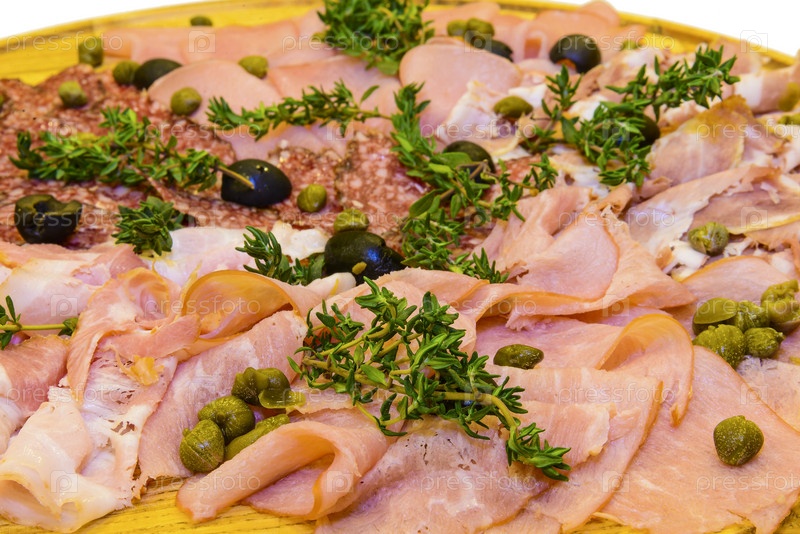 Нарезанная ветчина и колбаса с зеленью