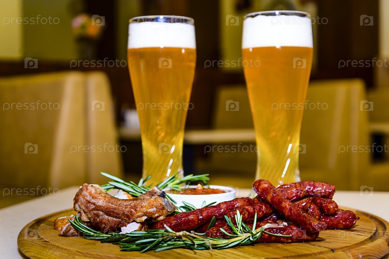 Сосиски и жареные свиные ребрышки с пивом
