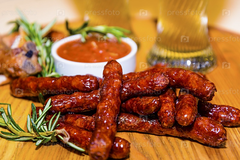 Сосиски и жареные свиные ребрышки с пивом