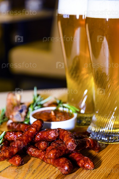 Сосиски и жареные свиные ребрышки с пивом