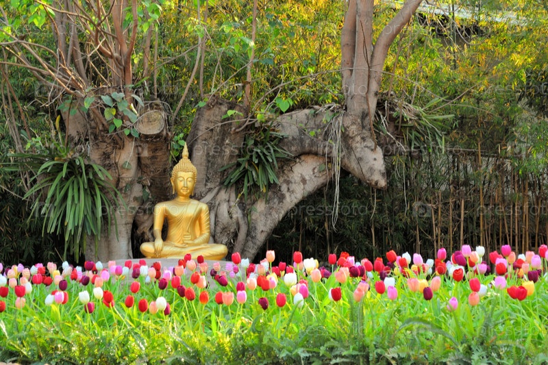 Будда в позе медитации среди цветов