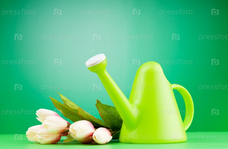 Тюльпаны и лейка на зеленом фоне