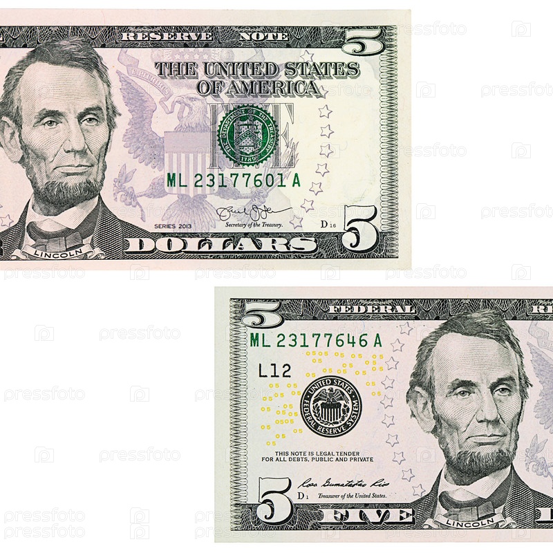Пять долларов, изолированные на белом фоне