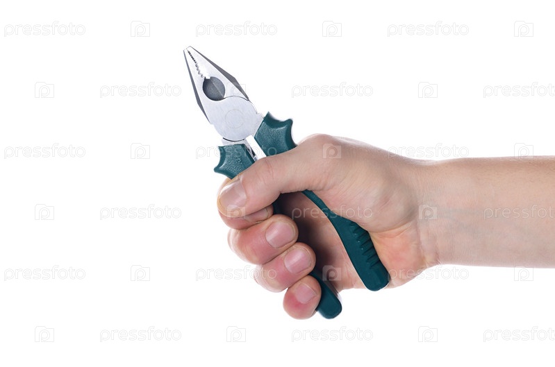 Плоскогубцы в мужской руке, изолированные на белом