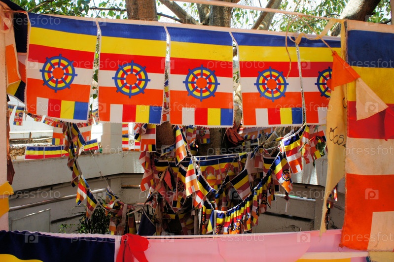 Буддийские флаги вокруг дерева в Канди, Шри-Ланка