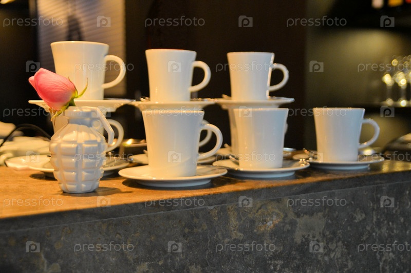 Фарфоровые кофейные чашки и ваза с розой