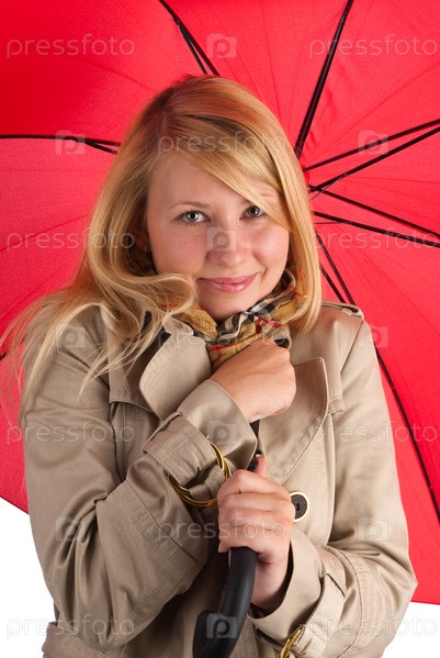 Красивая женщина с красным зонтиком изолирована на белом