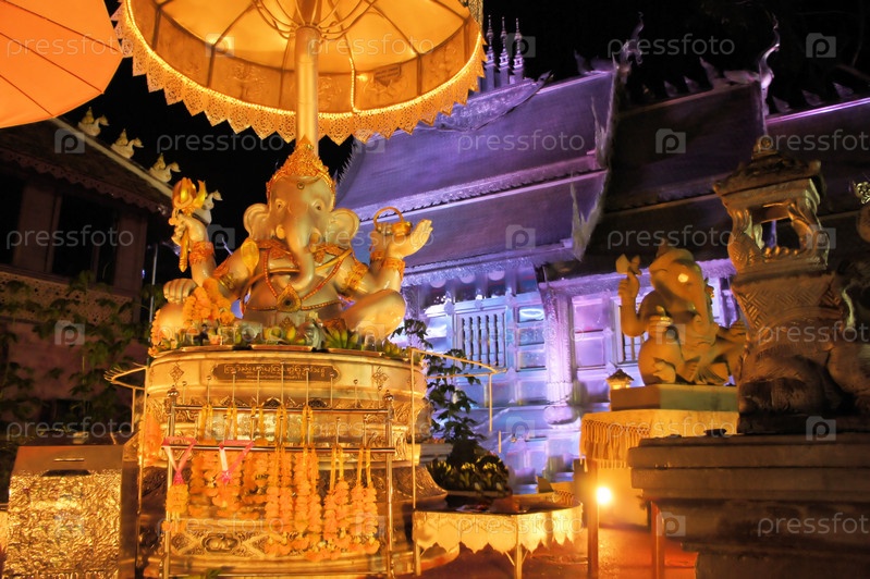 Бог Ганеша в освещенном храме Ват Шри Супхан в Чиангмае, Таиланд