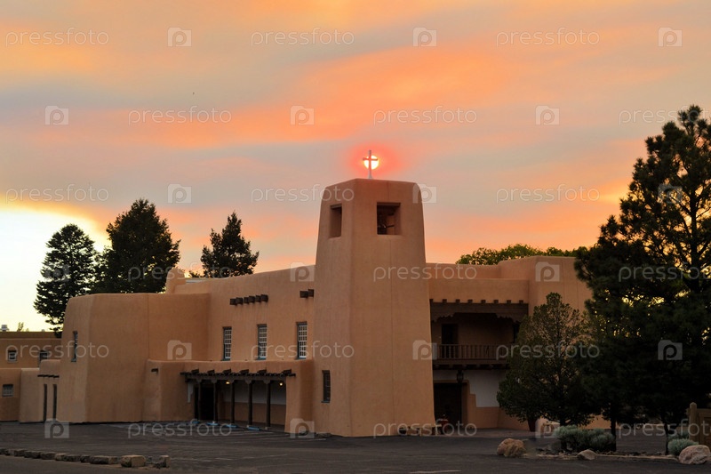 Церковь на закате в Санта-Фе, Нью-Мексико