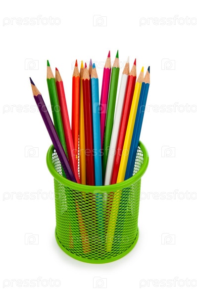 Разноцветные карандаши в подставке, изолированные на белом фоне