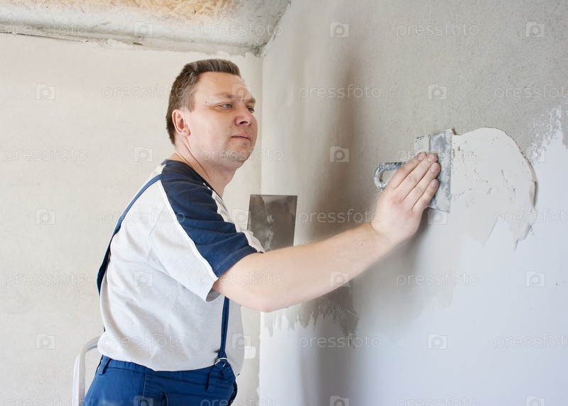 Рабочий штукатурит стену
