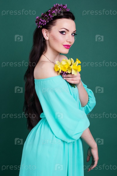 Красивая девушка в венке из фиолетовых цветов