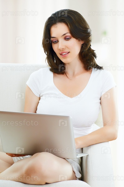 Девушка работает на компьютере в светлой комнате, сидя на диване